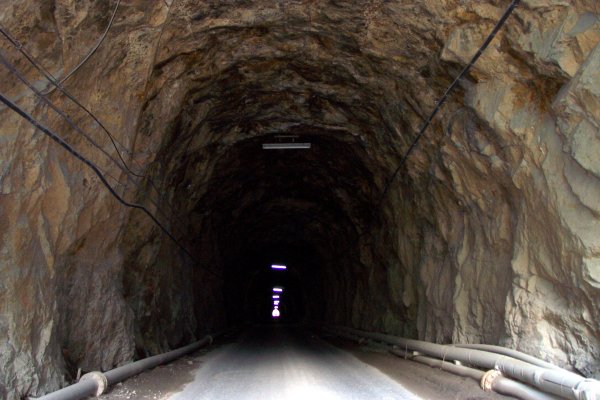 | 写真4.日窒鉱山事業場への入り口にあたる「雁掛トンネル」。素堀のトンネル内部には、道路の両側に送電線とパイプラインが走る。中津川から小倉沢への入り口にあたるこのトンネルは、自家用車がやっとすれ違うことができる程度の幅しかない。写真は日窒鉱山側から撮影したもの。奥に小さく出口の明かりが見えている。トンネル内は一定間隔で蛍光灯の照明が備わっている。 |