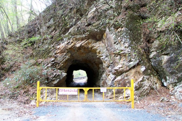 | 写真5.雁掛トンネルを抜けてすぐ右側に現れる、趣深いトンネル。いかにも廃墟へやって来たという感が強い。このトンネルの向こう側には、第一沈殿池(旧捨石堆積場)なるものがあるそうだが、立ち入り禁止のため確認は取れていない。なお、このトンネルの入り口には、立ち入りを禁ず旨の張り紙がしてあるが、落石の危険のみならずマムシも出没する場所なので、絶対に立ち入らないことという、極めて強い表現となっている。 |