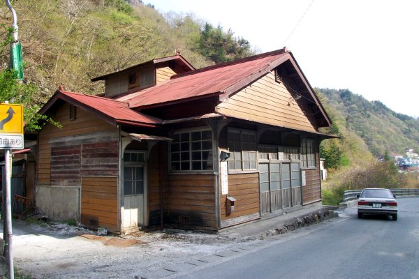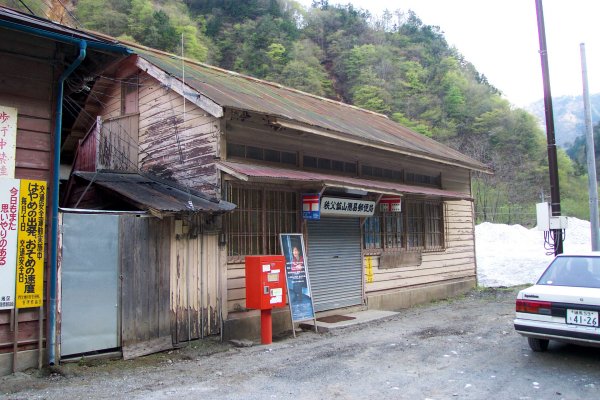 | 写真6.これは現役で使用されている施設。秩父鉱山簡易郵便局である。この日は休日のためシャッターが下りている。建物自体はかなり古く、いい味を出している。郵便局の隣には株式会社ニッチツの秩父事業所事務所が隣接しており、この辺りは現在の日窒鉱山の中心部とも言える。建物右側奥に見える白い山は石灰。 |