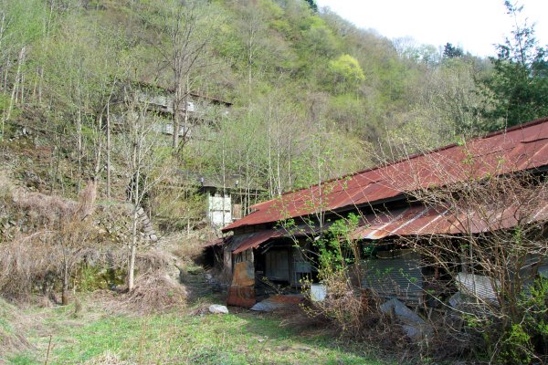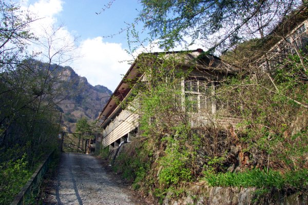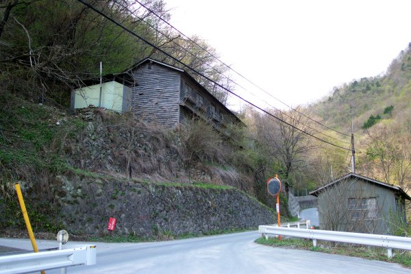 | 写真9.事業所事務所の先を少し進んだところにある廃屋。おそらく社宅だったところであろう。雁掛トンネルを出て初めて目にする廃墟らしい廃墟である。写真で左側に入って行く道があるが、これは第二沈殿池(雁掛捨石堆積場)へ通じる細い道路。急な上り坂になっている。第一沈殿池と異なり、こちらは舗装されているため、まだ使われているのかもしれない。 |