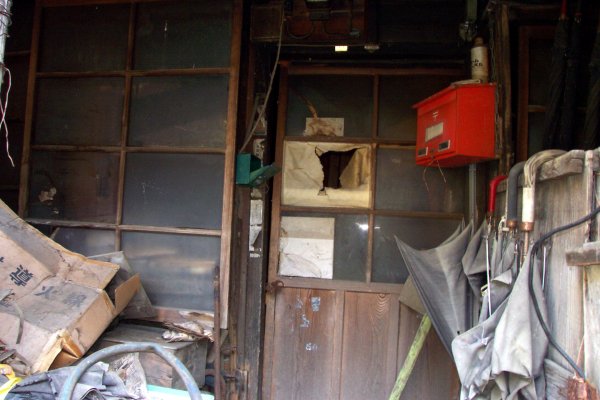 | 写真21.トタン屋根の廃屋の玄関。荒れ放題の軒先には、「導火線」のダンボール箱も見える。いかにも鉱山街らしい風景と言える。 |