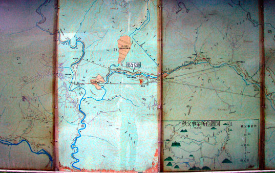 | 写真7.株式会社ニッチツの秩父事業所事務所全景。資源開発本部が置かれているところと思われる。ここも現役の建物。背後には、リシン及びタンカルの選鉱場がある。その奥に見える山は両神山。山間だけに日が暮れるのも早い。この写真を撮影したのは、午後4時近くであるが、すでに周囲は薄暗くなりつつあった。画面左端には、事業場全体の地図が架かっている。非常に大きなもので、事業場内の施設はもとより、坑道の位置まで詳細に記したものだ。 |