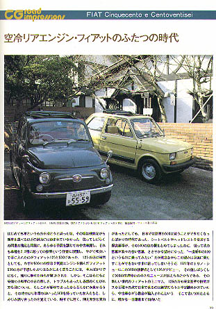 ■書 名:CAR GRAPHIC 1979 年 4 月号 ■定 価:750円 ■発 売:1979年4月1日発行 ■総頁数 :270頁 ■備 考: 自動車雑誌、カー・グラフィックの1979年4月号。この号の CG Road Impressions のコーナーに、「空冷リアエンジン・フィ アットのふたつの時代」と題して、FIAT 500F と 126 が紹介さ れている。紹介記事は全体で8ページであるが、FIAT 500 の試 乗記事は、現存するものが少ないため、貴重な情報である。記事 では、126 と 500F を比較しながら、126 の紹介を行うといった ものであり、両者の比較ができて面白い。バックナンバー雑誌と して、恵比寿のホビーショップ Mr. CRAFT にて購入した。 |