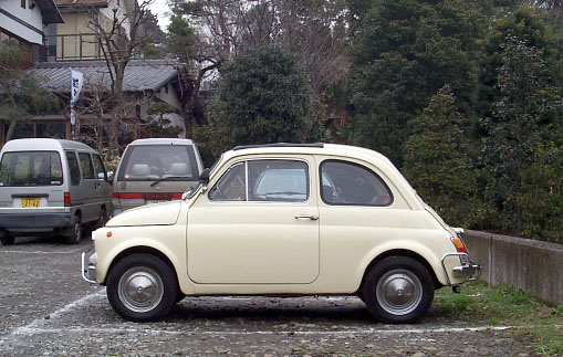 ・撮影日 :1999年03月25日(木曜日) ・撮影場所 :深大寺参道にある蕎麦屋の駐車場 ・使用カメラ:Kodak DC260 ・コメント : FIAT 500L 側面 波多 利朗の FIAT 500L を運転席側から見たところ。現代の軽自動車 が大きく見えるくらいコンパクトにまとまっている。FIAT 500 の全 長は 2970 mm と、3mを切っており、ホイールベースは 1840 mm し かない。外装の色番号はアイボリー222番。ホイールキャップは純 正品。タイヤは 12 イ ンチの 125 ラジアルを履くが、この製品は日 本では現在新品の入手が困難となっている。135 であれば日本でも新 品を容易に入手できるが、ハンドルをめいっぱい切るとホイールハウ スの内側を擦ってしまうそうだ。