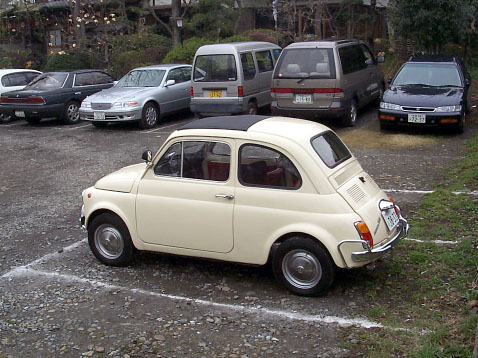 ・撮影日 :1999年03月25日(木曜日) ・撮影場所 :深大寺参道にある蕎麦屋の駐車場 ・使用カメラ:Kodak DC260 ・コメント : FIAT 500L 斜め後面 個人的にはこの角度から見た FIAT 500L が、一番気に入っている。 向こう側に並んだ現代の車と比べると、その特徴的な外観が余計に目 立つ。この写真は、深大寺参道にある蕎麦屋「深水庵」の駐車場にて 撮影したが、当日は蕎麦を食いに来たおじいさんの団体さんが、この 車をしげしげと見入っていた。なつかしいのであろう。