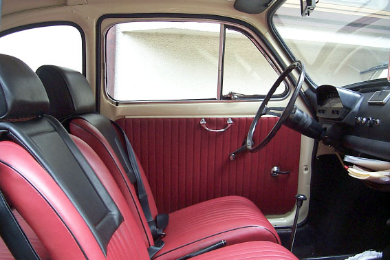 ・撮影日 :1999年04月04日(日曜日) ・撮影場所 :自宅カーポート ・使用カメラ:Kodak DC260 ・コメント : FIAT 500L 室内#1 助手席のドアから見た室内。購入時に内装は何色にするのかと聞かれ たため、外装のアイボリーに合う色でお願いしますと答えたところ、 店長さんはすかさずこのエンジを進めてくれた。なかなか良い色であ る。ヘッドレストはオリジナルでは付いていないため、かぶせ式の間 に合わせのものが付いている。これは今後きちんとしたものに変更す る予定。向かいのドアについているノブ類は、上から取っ手、ウイン ドウ巻き上げノブ、ドアオープンノブとなっている。取っ手は最初は 黒いプラスティック製であったが、アルミ製のものに取り替えた。車 検を通すため、シートには後付けの3点式のシートベルトが備わる。
