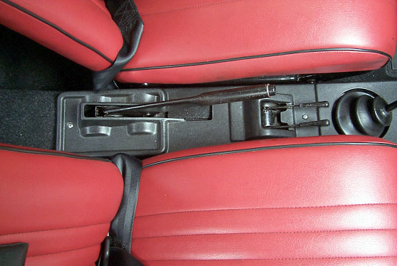 ・撮影日 :1999年04月04日(日曜日) ・撮影場所 :自宅カーポート ・使用カメラ:Kodak DC260 ・コメント : 運転席と助手席との間にあるレバー類。写真上側が運転席、下側が助 手席となる。2つの座席の間には、サイドブレーキレバーと、チョー クレバー、イグニッションレバーの3つが配置されている。写真で右 側に上下2つ並んだレバーのうち、上がチョーク、下がイグニッショ ンとなっている。すなわち、運転席に座った状態では、左側がチョー クで右側がイグニッションとなる。一番右端には、シフトノブのブー ツが見える。シフトは一速に入った状態となっている。通常の車では エンジン始動はキーを回すことで行うが、FIAT 500 の場合はイグニ ッションレバーを引くことでエンジンを始動させる。