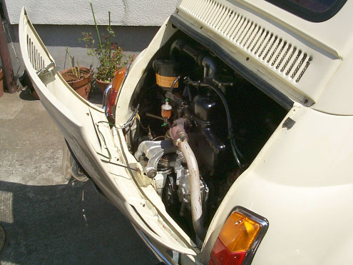 ・撮影日 :1999年04月04日(日曜日) ・撮影場所 :自宅カーポート ・使用カメラ:Kodak DC260 ・コメント : FIAT 500L エンジンフード リアのエンジンフードは、このように開く。ネジを数本外すだけで、 カバー全体を取り去ることも容易なので、メンテナンスは極めて良い
