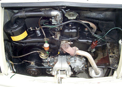 ・撮影日 :1999年04月04日(日曜日) ・撮影場所 :自宅カーポート ・使用カメラ:Kodak DC260 ・コメント : FIAT 500L エンジン全景 空冷直列2気筒 OHV エンジンの全景。ボア 64.7 mm、ストローク 70 mm の 499.5 cc 2気筒エンジンから、18 PS / 4600 rpm、3.1 kg-m / 2200 rpm を絞り出す。18馬力など、今のモンスターカーと比較 すると誤差の範囲のような非力な数値だ。左側の円筒形の部品が、エ アクリーナー、その下にダイナモが見える。左端にはデスビが配され ている。ご覧のように、エンジンルーム内部はスカスカで、メンテナ ンス性は良好だ。現在のマイコン制御の車の、複雑なエンジンルーム とは雲泥の差。教科書に出てくるようなエンジンと言えるであろう。