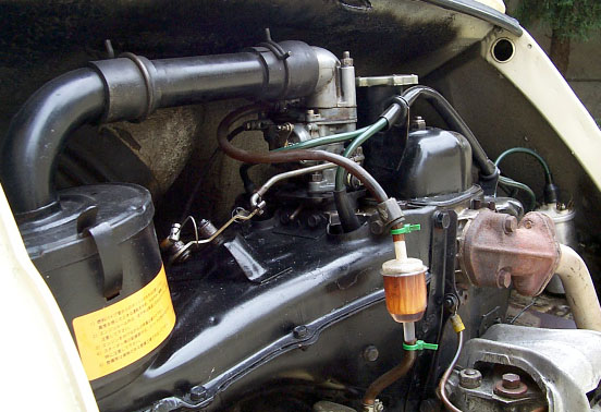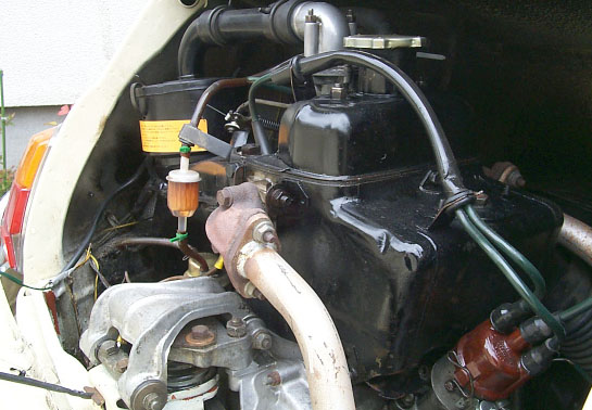 ・撮影日 :1999年04月04日(日曜日) ・撮影場所 :自宅カーポート ・使用カメラ:Kodak DC260 ・コメント : FIAT 500L エンジンアップ#1 中央に見えるフィルターが、ガソリンフィルターである。これはオリ ジナルでは付いておらず、後付けされている。中央上部には、ウェー バー製キャブレターが見える。