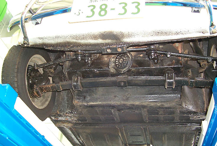 ・撮影日 :1999年07月21日(水曜日) ・撮影場所 :タイヤ館西荻窪店 ・使用カメラ:Kodak DC260 ・コメント : FIAT 500L フロントサスペンション全景 ウィッシュボーン+横置リーフという特殊な形式を採用しているフロ ントサスペンション全景。左右両輪の間に渡った横置きのリーフスプ リングがユニークである。画面中央の丸いものは、クラクションのホ ーン。Lタイプでは、ホーンはこのようにリーフスプリングの前に位 置している。Fタイプでは、ホーンはフロントボンネットの中に配置 されていた。リーフスプリングの上には、ウォーム・アンド・ローラ ー形式のステアリングメカの一部が見える。FIAT500には、牽 引フックが装着されていない。そのため、牽引を行う場合には、横置 きのリーフに直接牽引ロープを引っかけるそうである。間違ってフロ ントバンパーに引っかけると、全面パネルが剥離してしまうので、要 注意だ。