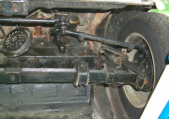 ・撮影日 :1999年07月21日(水曜日) ・撮影場所 :タイヤ館西荻窪店 ・使用カメラ:Kodak DC260 ・コメント : FIAT 500L 左前輪部分のアップ 左前輪部分を下から見上げたところ。ちょうど運転席の裏側になる。 ウォーム・アンド・ローラーのステアリング軸が中央に見える。この 軸の先にハンドルが装着されている。ウィッシュボーンの前輪サスペ ンションとドラムブレーキが良くわかる。画面左端にある丸い物体が クラクションホーンである。