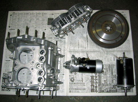 写真1.加工・整備が終わった部品類 これが今回、加工および整備が終了した部品類。クランクケースはボーリング、シリンダーヘッドは無鉛化対策とバルブシート打ち替え、ダイナモとスターターモータは全バラ・オーバーホール済み!フライホイール面研といったところ。 |