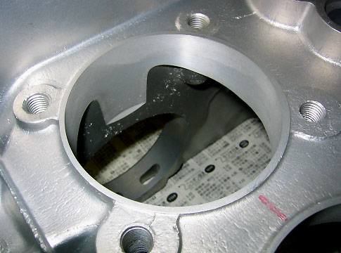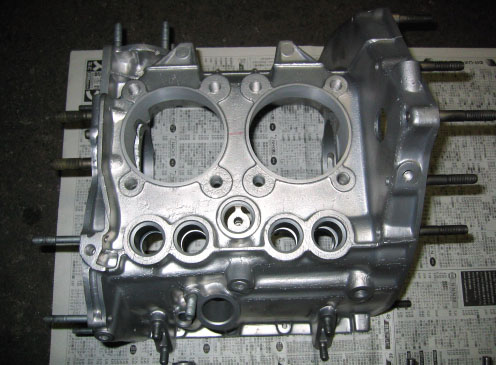 写真2.ボーリング処理が終了したクランクケース 今回、660ccボアアップに伴い、クランクケースのシリンダ穴もボーリングにより拡張した。 |