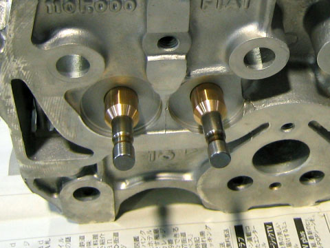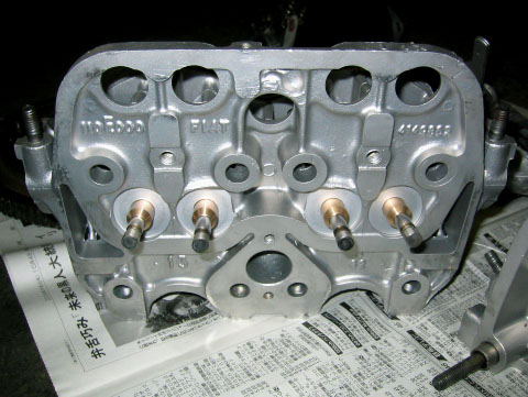 写真5.シリンダヘッド バルブガイドの輝きがまぶしい。バルブガイドについては、オンタリオさんにてリン青銅のワンオフパーツに交換してある。対摩耗性に優れた素材とのこと。イタリア製オリジナル保守パーツは寿命の点で用いない方が良いようだ。このような細かい所にまでノウハウが詰まっている!!! |