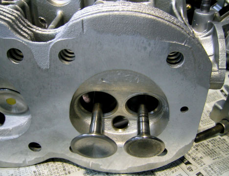 写真6.バルブのアップ 穴径の大きな方がインテークバルブ、小さい方がエグゾーストバルブ。インテーク側はバルブシートの打ち替え処理を、エグゾースト側は無鉛化対策を施している。上面が僅かに面研された様子も判る。 |