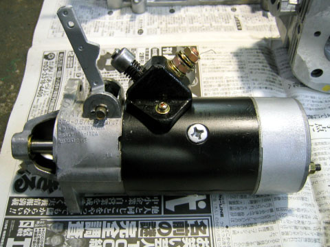写真9.オーバーホールが終了したスターターモータ 向かって左側がフライホイール側。上面に配置されたアームは、ワイヤーで運転席横にあるスターターレバーに接続される。チンクェチェントのエンジンスタートは非常に個性的な方法を採用しているが、この部品を見ると動作が良くわかる。 スターターレバーが引かれると、上面アームはモーター内部のギアをフライホイール側へと押し出すと同時にスイッチを操作し、モーターに電流を流す仕組みになっている。なかなか良くできたメカだ!!! |