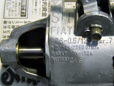 写真10.スターターモータ上面に記載された刻印 アームの横には刻印が施されていた。0.68KW、10V、130Aといった文字が記載されている。 |