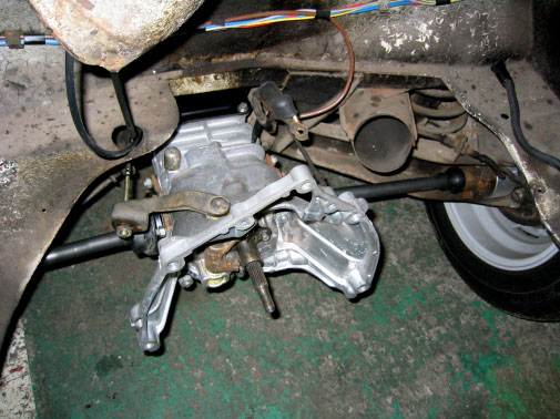 写真12.車体に搭載されたミッション 既にオーバーホールが終了したミッション・コンプリートは、車体に搭載されていた。大分クルマみたいになってきた。エンジンルーム内部は塗り替えていないため、かなり汚れているが、ミッションはピカピカ!!!ああ〜〜アンバランス・・・・そのうちエンジンルームの中も再塗装することにいたしまショっと!!! |