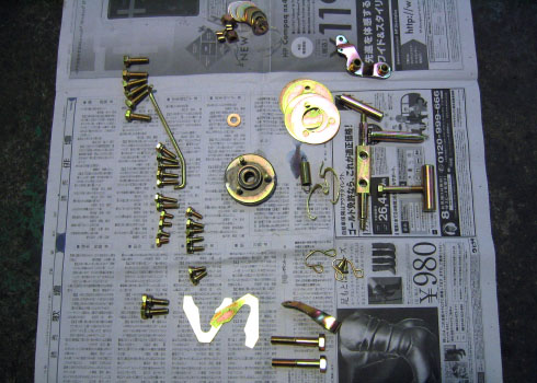 写真1.クロメートメッキが終了した部品類 ボルト、ナット、ワッシャー等の細かい部品のメッキが終了。ダイナモプーリーやエンジンマウント用ボルトもメッキ処理が施された。細かいパーツになってしまうと、実車のどこに使用されているのか、なかなか見当が付かない。。。 |