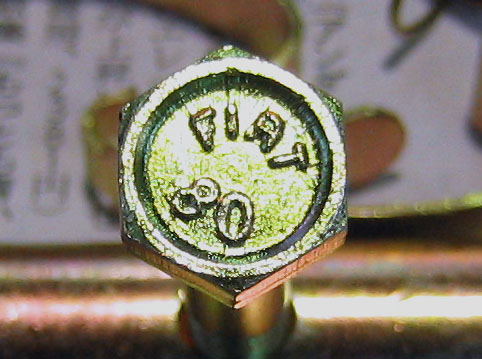 写真4.エンジンマウント用ボルトの打刻 驚いたことに、ほとんどのボルト類には、このような打刻が施されている。洗浄前には気が付かなかったのだが、ボルト1本1本に「FIAT」や「110」といった刻印が見受けられる。純正の証!!! |
