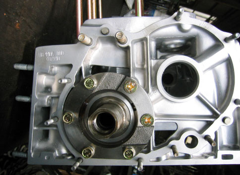 写真11.クランクシャフト側から見たクランクケース こちらもメインベアリングが取り付けられている。 |