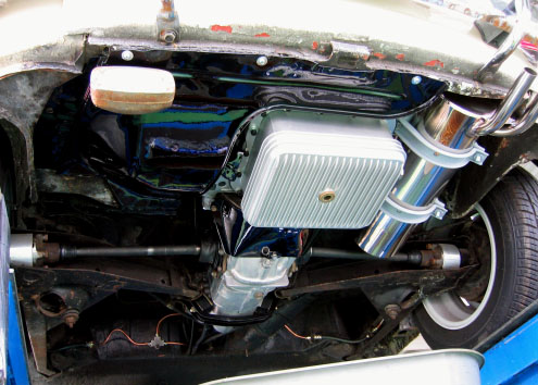 写真2.エンジンルームの下側 今回オーバーホールした部分がビカビカに光っている。やっぱステンレスマフラーは迫力があるな! |