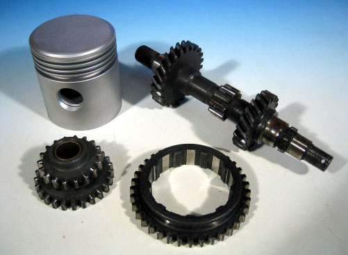 写真8.オーバーホールの記念品 カウンターギアシャフト、ローギア、リバースギア、ノーマルピストンは、パーツクリーナーで丹念に洗浄した後、記念品として保存。机の上に置いてニヤスカ眺めては楽しんでいる。。。 (;´Д`) ビョーキだな・・・・ |