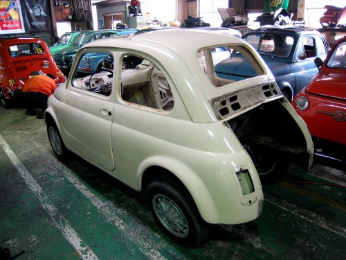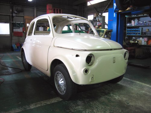 写真1.いよいよ板金塗装の準備が完了した500 2007年11月14日から11日後、筆者の500はこのような姿となって、オンタリオSSさんの工場に佇んでいた。 |