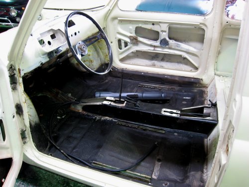 写真5.運転席ペダル部分 ペダル類も前部取り外されている。若干の錆は出ているものの、グサグサになっていたり穴が空いていたりはしていないので、上々のコンディションだと言えるだろう。ステアリングの右側にある黒く丸い部分は、ブレーキマスターシリンダーの末端。手前にシフトノブが見える。 |
