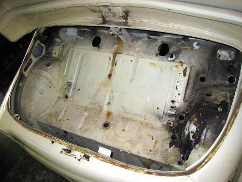 写真8.バッテリ格納部分 一番クリティカルな部分が、フロントラゲッジルーム内にあるバッテリ格納部分だ。ここが酸でグサグサになっている場合が多いのだが、幸いそのようなことも無く、しっかりとしていた。 |