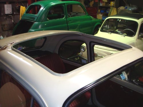 写真9.キャンパストップを外したルーフ この部分は、長年に渡り一生懸命磨いてきたので、まだまだ塗装はキレイである。 |