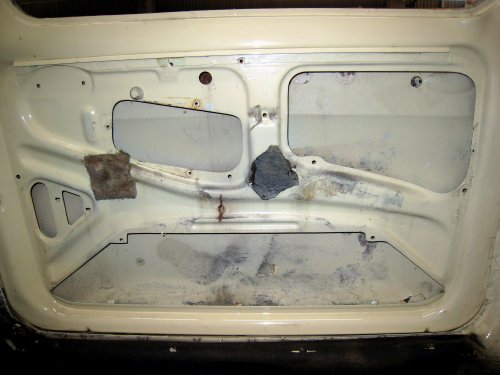 写真12.運転席側のドア内部 500は、ドア下部にある3カ所の水抜き穴から、入ってきた水を排出する構造になっている。この穴が詰まると水がドア内部に溜まり、錆を発生する。購入時から、穴が塞がらないよう、メンテナンスしてきたせいか、思ったよりキレイであった。 |