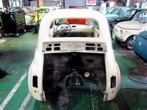 写真2.エンジンを降ろされた500の後ろ姿 ウィンカーランプも含め、全て取り外されている。 |