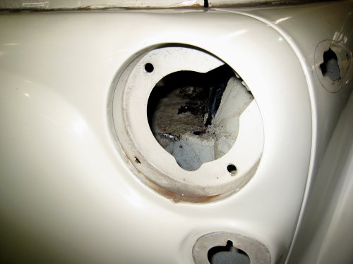 写真7.フロントラゲッジ部分 電磁燃料ポンプを装着した際に開けた穴(左側ホイールハウス部分に開けた2つの穴)も、今回塞ぐ予定。 |