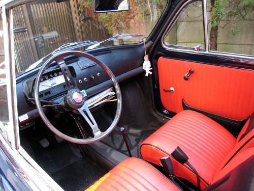 2008年3月14日、待ちに待った納車の日である。2007年11月14日に引き取られて以来、丁度4ケ月振りに戻ってきた500。奇しくもこの日は、FIAT社がNEW 500を日本で発売する前日という、いかにも意味深い日である。当初、正午頃の納車を予定していたのだが、天気が崩れそうな雰囲気だったので、早めの時間に変更される。 オンタリオSSのトランスポートサービスより降ろされた筆者の500は、すぐに駐車場に入れられた。あいにくの小雨が降ってきたからだ。水滴がボディ上で玉のようになっている。3度に渡る重ね吹き付け塗装を行い、さらに耐性ポリマーをかけているので、表面はまるで鏡のようだ。こりゃぁ、大変なことになっちまっただ。。。運転するにも気が抜けない。 納車後、オンタリオSSさんより、簡単にメンテナンスの指導を受ける。今回の塗装色はキズが大変目立ち易いので、ボディが乾いた状態で拭くようなことはせず、必ず水で洗車して表面のホコリを完全に落としてから拭くこと。拭く時も、以前はぞうきんを使っていたが、拭きキズを付ける原因となるため、専用のウェス(80%のPolyesterと20%のPolyamideでできた布)を用いること。ウェスはオンタリオSSさんより、数枚頂くことができた。ポリマーがかかっているので、基本的にワックス処理は不要。但し、バンパーについては、洗車後時々ワックスをかけておいた方が良さそうだ。 今回のオーバーホールでは、ドア周囲の防水ゴムも新品に取り替えている。そのため、ドアを閉める際に、若干勢いが必要となる。このとき、ドアノブだけを持って「バタン」と閉めると、ノブ周囲の塗装に応力がかかり、ヒビ割れを誘発する。従って、ドアノブを持つと同時に、もう一方の手をドアピラーもしくはドア本体部分に当て、力を一カ所に集中させずに両手で押し込むようにして閉めるのが良い。なお、内部からドアを閉める場合には、ドアポケットを持って引っ張ると取れてしまうので注意。必ず窓を開け、ドア本体を持って閉める。 さて、今まで内装については触れていなかったが、これはほぼドンピシャだという色の布地があったとのご連絡を頂いていたので、オンタリオSSさんにおまかせしていたためだ。というわけで、内装色をこの目で見るのは、今日が初めてである。おまかせしただけのことはあり、確かにカタログ色そのものだ!目にも鮮やかな朱色である。ボディの茄子紺とのコントラストがいい感じに仕上がっている。 シートもオーバーホールして、アンコも盛り直してある。従って、座り心地も以前の煎餅布団のような感じとは打って変わり、ふかふかだ。運転してみて最初に感じたのは、乗り心地の良さとボディの剛性感である。シートは以前よりも盛りがあるため、着座位置が若干高くなった。 しかし、今思えば、良くここまで手を入れたものだ・・・連載開始から28回目で、エンジン、内装、外装のオーバーホールが完了。今までに無い達成感がある。その一方で、これだけキレイになった車体のメンテナンスには、今まで以上に気を使わなければならん。今回納車されたクルマの状態は、まさにショーコンディションレベルであった。愛好家の中には、このままガレージにしまい込み、あまり外で運転させないような方も多いと思う。しかし、筆者の場合は別だ。500は基本的に足代わりに使っていたし、今後もその予定である。さすがに雨の日は乗らないが、オーバーホールしたからといって、必要以上に神経質にはならないようにしようと思っている。 形あるものはいつか壊れる。ここまで仕上げたのであるから、精一杯のメンテナンスを行うつもりではあるが、足代わりに使用すれば、それ分ヤレるし、塗装にもキズが付くだろう。でも、それはそれで良いのである。元々、イタリアの庶民のために作られた、究極のファミリーカーなのだ。明日、2008年3月15日は、日本でのNEW FIAT 500の発売日である。その前日に納車というのも、これも何かの因果であろう。そうは言いつつも、とりあえずおっかなびっくりで、キズを付けないよう恐る恐る運転する、ケツの穴の小さい筆者なのであった・・・ ヽ(´ー`)ノ