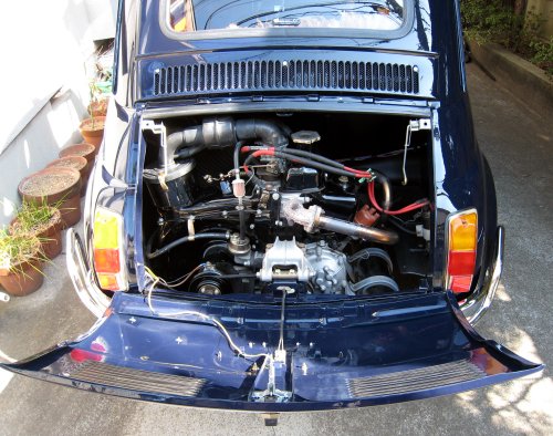 写真3.駐車場に戻ってきた500 #2 フロントボンネットは「焼き」を入れてある。これは、バーナーで蚊取り線香のような螺旋を描くように鉄板をあぶるという作業だそうだ。焼きを入れると硬度が増して、剛性がアップする。確かに、ボンネットの開閉時、以前のようなペナペナな感じは微塵も無い。 |