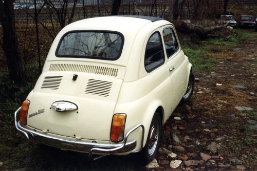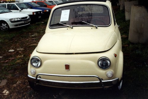 筆者の500は、1998年11月15日、東京都内にあった某ショップで購入したものだ。FIAT 500の購入は、基本的にBTOであるため、受注後イタリアで塗装、メンテナンスを開始し、日本へ輸送されてくることになる。従って、購入した時点では、筆者は自分のクルマがどのような外観をしているかを見ていない。内装、外装の色と年式(Lタイプ)を指定したのに過ぎなかったのだ。。。 さて、上記に掲載した写真は、1998年12月27日に、イタリア現地のモータープールで撮影されたものである。塗装を終え、明日にも船に積み込まれる500を、現地エージェントが撮影し、東京へ郵便で送ってくれたものだ。船便による輸送には約2ケ月を要するため、筆者が現車を見たのは、実はこの写真が初めてだったのだ・・・ そぼ降る雨の中、舗装されておらず小石だらけの寂れたモータープールの一角で、フロントボンネット半開きの状態で撮影されたこの500の表情は、なんだかとっても寂しくて不安そうである。これから向かう異国の地で、一体どんなオーナーが待ち受けているのか?新オーナーはキチンとメンテして乗ってくれるのか?「嫌だ!オレは行きたくない!」とでも言っているような表情だ。とにかく、筆者が最初にこの写真を見た時に感じたのは、このようなことだった。 その後、現車は1999年2月24日(水曜日)に、横浜港に無事到着。関税手続きを経て都内のショップのヤードに保管された後、3月21日(日曜日)に筆者宅へ納車された。