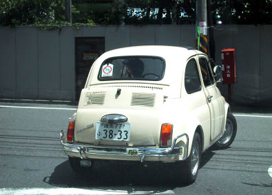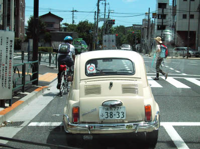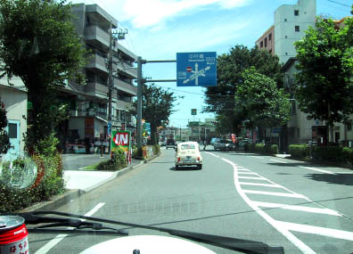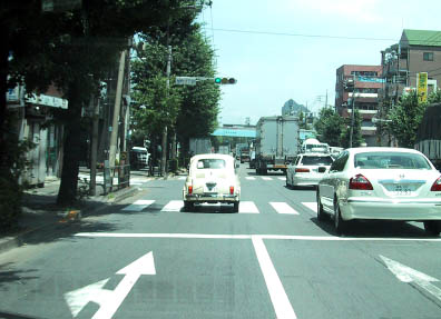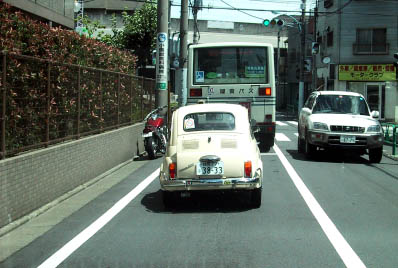 | 写真5.笹目通りの左斜線を、よろよろと走るチンクェチェント。 そこそこの混み具合なので、スピードも抑え気味で助かる。どの車もエアコン 全開で窓は鬼のように閉め切っており、見るからに快適そう。時々隣りの車線 を走る車から、奇異な目で見られる。いったいこの暑い最中、何をやってるん だといった感じ。。。。いや、実際何やってんだかなんだけどね。 |
