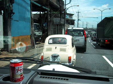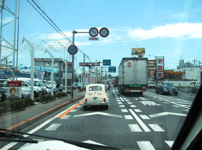 | 写真7.筆者のビート購入店である「オートテラス 城北」前を通過中。ビートだとここまで来るのに何の苦労も要らない が、これがチンクェチェントで、しかも真夏となると話は別だ。渋滞 もようやく先が見えてきて、胸を撫で下ろす。出発後、約1時間が経過。 しかし、まだ新大宮バイパスにすら入っていない。今回の行程の、40% といったところなのだ。 Sigh・・・・ |