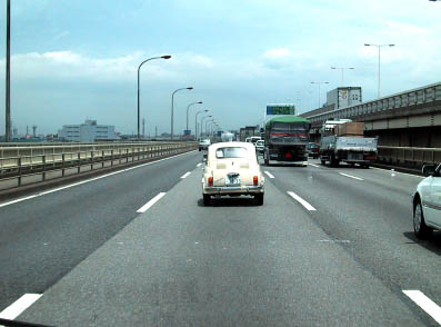 | 写真8.笹目橋を渡るチンクェチェント。ビートな らば2速で8,500rpmまで引っ張り、日ごろのウサを晴らす ポイントなれど、非力なチンクェチェントでは、周りの車のペース について行くだけで必死。しかし渋滞も解消され、三角窓からは 生温いものの風も入ってきて、気持ちよい。生きてて良かったと思う 瞬間。 |