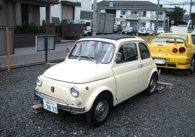 | 写真11.無事埼玉某所の駐車場に入ったチンクェチェント。 炎天下での地獄の50kmドライブも、ようやく終了。途中、渋滞もありかなり 厳しい条件であったにもかかわらず、機関は問題無く、まだまだ大丈夫そうで あった。しかしパーコレーションの兆候は見受けられた。フューエルストレーナ に全くガソリンが入っていないのだ。これがもう少し進めば、キャブで全ての 燃料が蒸発してしまい、エンストを起こすところである。ギリギリセーフと いったところか? |