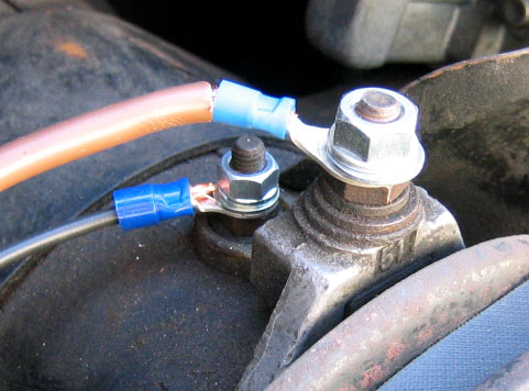 写真9.ダイナモ端子のアップ ダイナモの端子に接続するコードは、お約束に従いちょっとだけ太いものを採用している。安定した電源を供給するための小技。 |