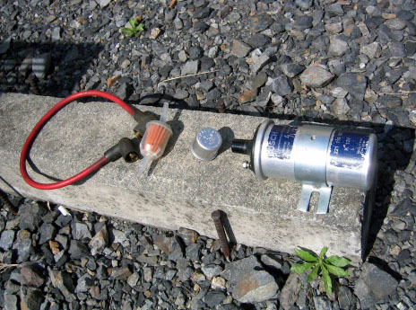 写真4.ミツバ製電磁ポンプユニット 意外に大きかったのが、ミツバ製電磁ポンプユニット。搭載場所はパーコレーション防止のため、フロントボンネット内部に固定する。このポンプユニットの大きさは、約20cm以上ある。そのため装着場所には若干工夫が必要。ミツバ製電磁ポンプは、燃圧0.3kg/m2。機械式ポンプがどの程度の仕様なのかは不明。駆動用12V電源は、ヒューズボックスから直接接続する。 |