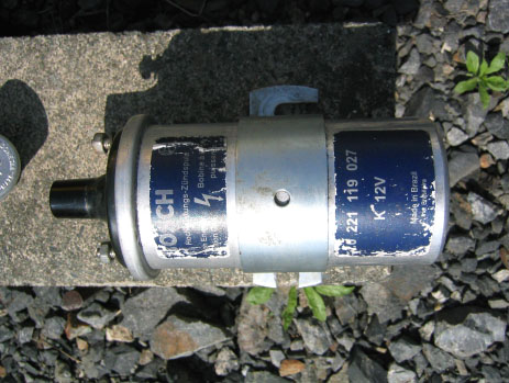 写真11.交換したイグニッションコイルユニット 今まで使用してきたイグニッションコイル。BOSCH製でメイド・イン・ブラジル。製品の信頼性はかなり高く、4年以上に渡って、ノントラブルで高圧を発生していた。当然まだ使用可能。これは常時車内に置いておき、何らかのトラブル発生でノーマルの点火システムに戻す場合に使用する。 |