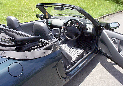 ・撮影日 :1998年06月20日(土曜日) ・撮影場所 :伊豆一碧湖イトーピア一碧別荘地内 ・使用カメラ:Kodak DC210 ・コメント : BEAT室内 フロントウインドウには、スカイサウンドのスピーカーが配置されて いる。シートはヘッドレスト一体タイプのバケット型。ゼブラ模様で かなり目立つ。室内は非対称レイアウトを採用しており、ドライバー ズシートの方が、助手席よりも、幅が 25 mm だけ広くなっている。 ドライビングポジションはあくまで低く、一回座ってしまうと、その 座りの深さで、車から出るのが面倒になるほどである。シフトノブ横 に見えているのは、カーナビのディスプレイ。