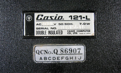写真7.Casio Model 121-L 本体裏面銘板のアップ |