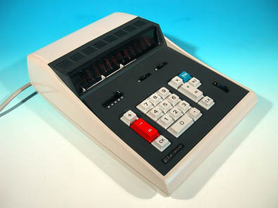 ■SANYO サコム Model ICC−1211 三洋電機株式会社初期の電卓、サコム ICC−1211である。外形寸法 30×20×9cmという巨大な電卓で、電源トランスを内蔵しているため重 量もかなりある。本機は極めて珍しく、ほとんどデッドストック状態で保存さ れていた。 ケースのデザインは、70年代スペースエイジそのもので、どことなくシャ ープのコンペットシリーズを思い浮かべてしまう。そういえば、赤と青のポッ プな配色を施されたキーボードも、コンペットと良く似ている。残念ながら、 本体には製造年月日を示す表示が一切無く、いつ頃の製品であるのかは不明。 内部構造等から判断すると、1972年〜74年頃のものと思われる。仕様的 には12桁の四則演算電卓であり、特に特徴といったものは無い。メモリ機能 を内蔵しており、小数点はレバーにより0,2,3,4,6に設定可能。この 他に、定数乗除算を行うための定数スイッチ(K)と、積和差、商和差を求め るためのシグマスイッチ(Σ)が付いている。
