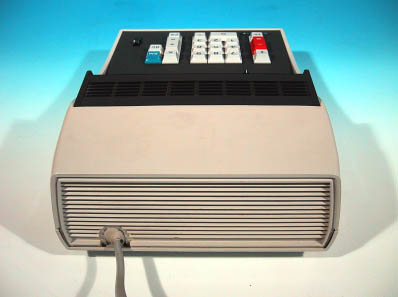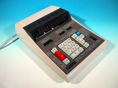 表示は7セグメントタイプを1桁ずつガラス管に封入したタイプのニキシー 管。蛍光表示管としては後期タイプのものである。発光色はオレンジ。マイナ ス符号は、専用のネオン管で表示するようになっている。 電源コードは本体から直接出ており、取り外しはできない。定格は14W、 シリアル番号はT206985Cとなっていた。本モデルは、ICCという型 番からも想像できるように、ICを使用した電卓である。ディスクリート部品 を多く使用していた当時としては、ICを使った電卓はまだ珍しかったものと 見え、上部のロゴにも「IC」の文字が記載されている。この電卓には、親切 にも使い方を示した紙のパネルが付いていた。このパネルを電卓上部に置くこ とで、各キー操作の説明を見ることができるのだ。しかし、電卓に説明など、 不要にも思えるのだが。。。。。 構造的にはマイコンによる制御を行っていないため、電源をONにすると、 最初は全桁の蛍光表示管に、わけのわからない数字が表示される。よって、電 源ON時には、オールクリアキーを一回押してリセットをかける必要がある。 このあたりの仕様も、初期の電卓に良く見受けられるものである。