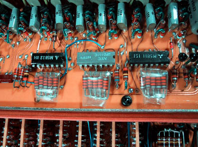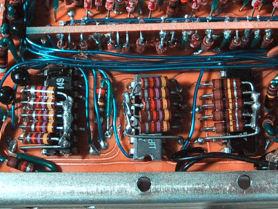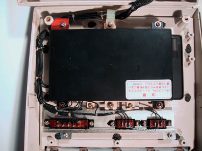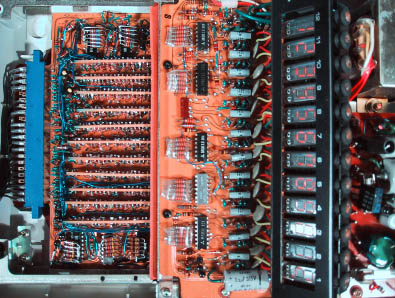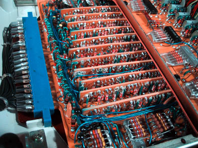 内部構造はかなり壮絶である。内部は蛍光表示管表示部分、ロジック部分、 電源部分およびキーボード部分の4つから構成されている。いずれの基板も、 ベークライト製だ。一番下に位置するロジック部分の基板を見て驚いた。基板 の上に11枚のサブボードとも呼べる基板が実装されているのだ。それぞれの サブボードは、高さ約15mm、長さが約12cmの細長い形をしており、基 板上にはダイオードと抵抗がこれでもかというくらいに実装されている。すご いことに、これらのサブボードは形も不ぞろいなのだ。つまり、ひとつひとつ 手作りで切り出して実装されているもののようだ。ボード間には配線用のワイ ヤが飛び交い、一見すると実験室のバラックモデルのようにも見える。 サブボードがマウントされているロジック基板のメインボード上には、両側 に14PinのICが配置されているのだが、このICの上にも抵抗が実装さ れている。実装状態を見るに、どうやらプルアップないしはプルダウンのため の抵抗と思われる。集合抵抗があれば、このようなアクロバチックなことをや らずに済んだものを。。。なお、実装されているICは、三菱製M5811、 NEC製μPD101C等が使用されていた。 ロジック基板のコネクタ近くには、無数のダイオードがマウントされている のだが、これらのダイオードの一つ一つに、ノイズ除去用のビーズが付けられ ているという芸の細かさも見受けられる。これは、果たして量産された製品な のだろうか?それとも、当時の製造技術では、これが一般的なものだったのだ ろうか?いずれにせよ、人知を超越したような手間がかかった構造になってい るのだ。